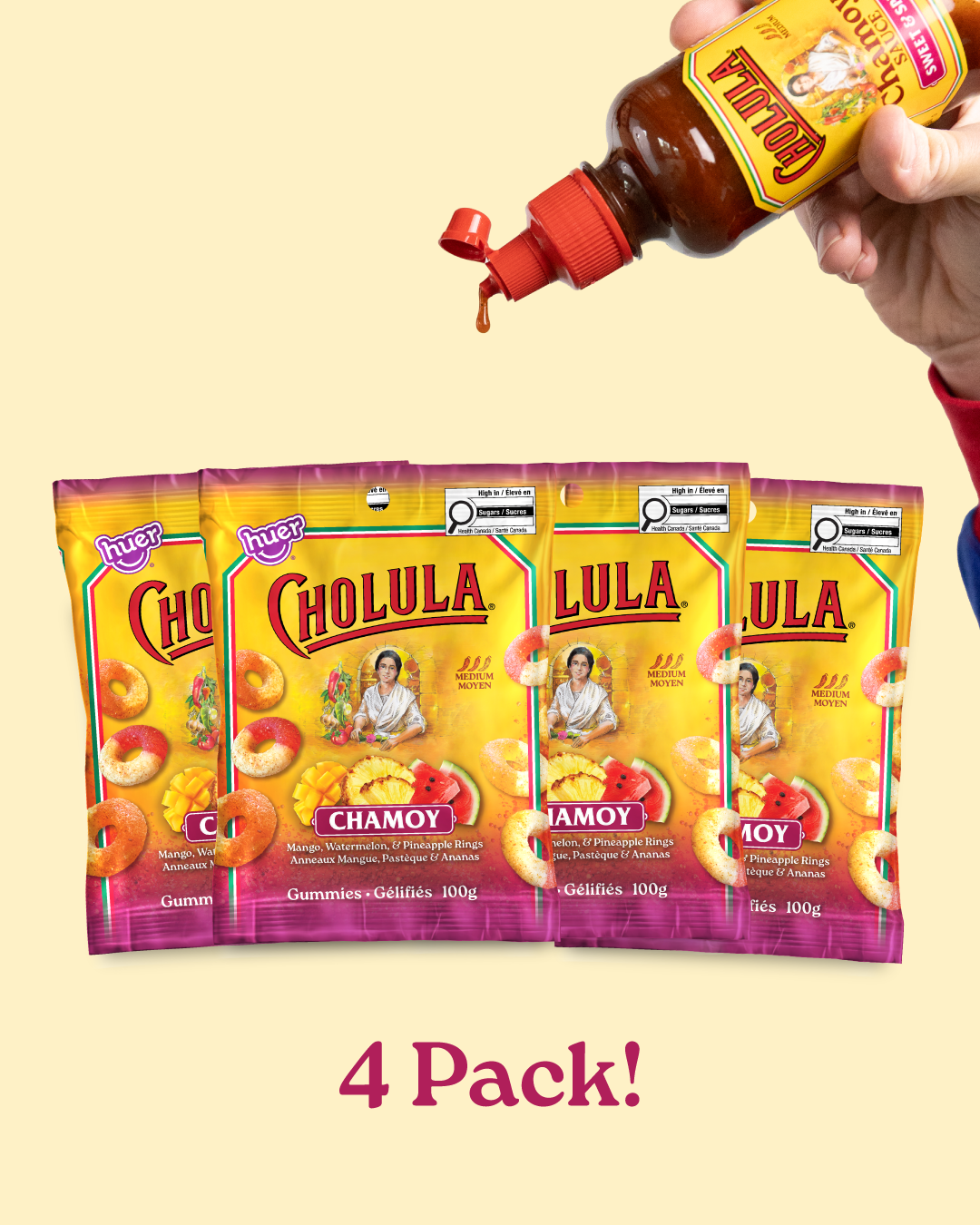 Contenu : 4 sachets de 100 g du délicieux mélange tropical d’anneaux Cholula® Chamoy.